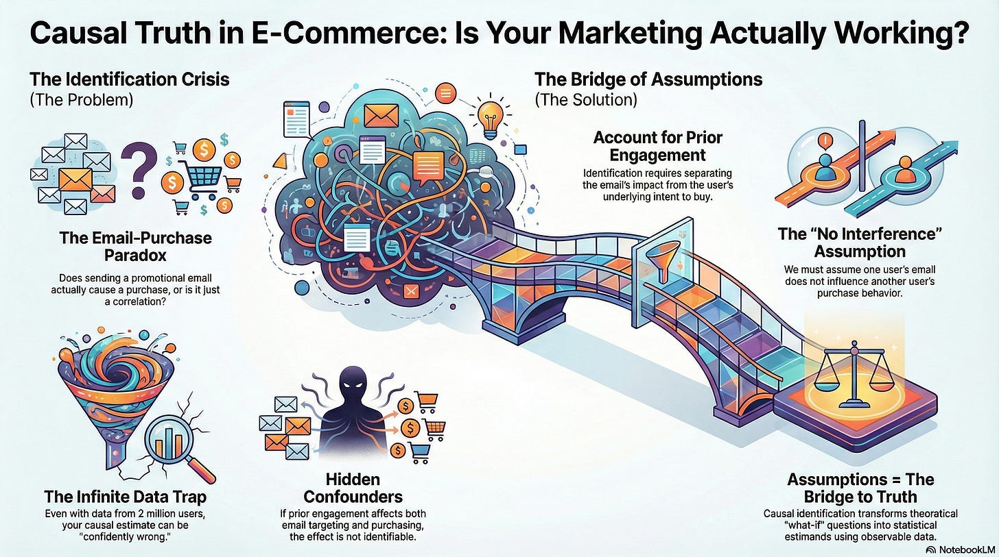 A model trained on petabytes of user data can have 99% validation accuracy but still yield a causal estimate that is “confidently wrong”. Without identification, we are not just producing unreliable results; we are potentially generating misinformation masquerading as truth.