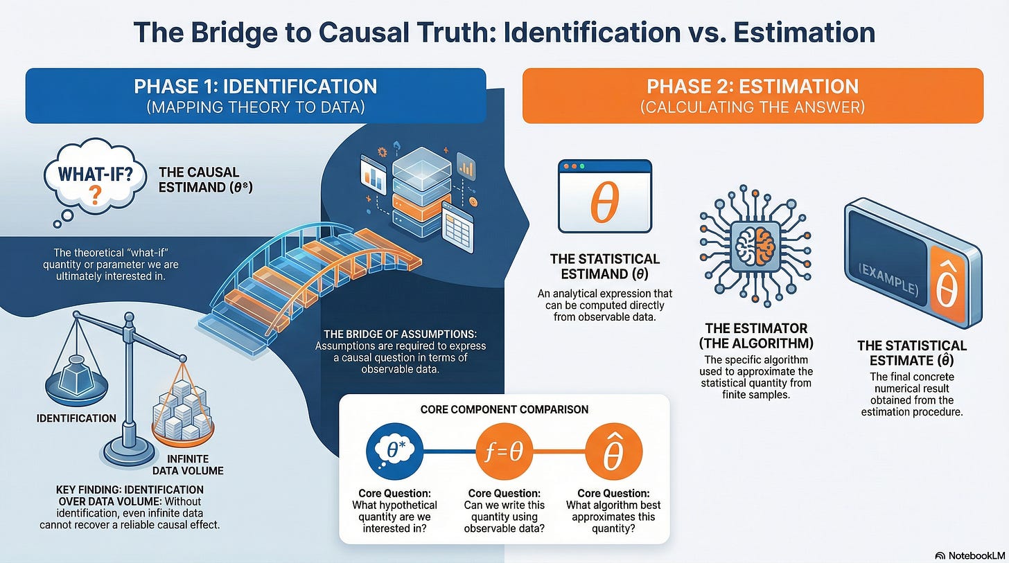 To avoid this, we must separate our workflow into two distinct phases — first mapping theory to data by transforming a causal estimand into a statistical estimand via explicit assumptions (like “no interference”), and only then moving to estimation to calculate a numerical result. Ultimately, identifying a causal effect is what distinguishes true scientific insight from mere correlation, requiring us to prioritize the validity of our assumptions over the sheer volume of our data.
